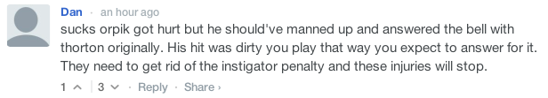 I appreciate the concern on your part, but this feels like a knee-jerk reaction to hockey violence that has been heard again and again. I see no furthering of the argument against it here. Again, I won’t defend Thornton, but I want to see the push against this behaviour from writers to be more fleshed out.