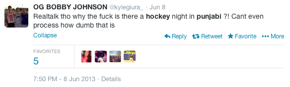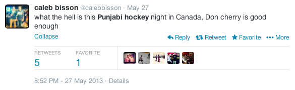 There are only two players of Indo-Canadian descent who have played in the NHL: Robin Bawa and Manny Malhotra. Yet, there are a bunch of young Indo-Canadian draft picks such as Prab Rai, Kevin Sundher, and Jujhar Khaira waiting in the wings to make their mark and inspire more youth to get involved in the still white as ice game. The Punjabi community has also fought every time the HNIC Punjabi broadcast has been turfed due to lack of funding, and each time they have been successful with a revival. There is clearly a thirst for the game but, despite the common love of hockey, Canada has demonstrated time and again that many people still expect hockey to be a white game. Last year, when Gurdeep Ahluwalia and Nabil Karim hosted TSN’s Sportscentre tweets about terrorists, Arabs, Punjabi hour, Harold and Kumar, and the Middle East floated around Twitter. And these were two anchors who do not wear turbans and were speaking in English! By and large, a quick search on Twitter has revealed an abundance of acceptance and excitement for the Punjabi broadcasts (both HNIC and the Calgary Flames), which is great. However, it didn’t take long to find these tweets either: