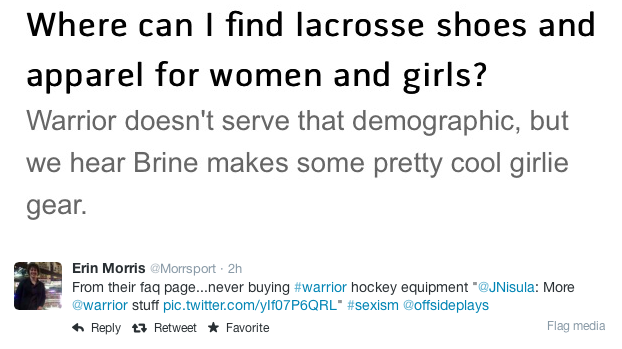 So, okay they don’t make women’s gear – they have made that abundantly clear. And no one is asking them to go out of their way to include women. But then why does Warrior go out of its way to make women (or men shopping for women) with the intent of purchasing its equipment feel like crap? I’m going to go out on a limb and speak on behalf of all women athletes and tell you right now, we already feel like outsiders so there is no need to rub it in. We know that there are very few women’s specific items on the shelves. We know that even if we find something in a men’s that we like it probably won’t come in an appropriate size for us. We know that hockey, lacrosse and soccer (the three sports that Warrior deals with) were not made for us. No need to put it in writing.
