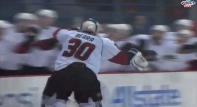 - When AHL goalie Reto Berra of the Lake Erie Monsters scored an empty net goal, he reacted as most players do – by skating by his bench to high-five his teammates. Players on the rival Chicago Wolves took offense, and started rough play in reaction. Jeff Veillette argues that this incident reflects an out-dated conservative hockey culture, and that the sport needs to start taking its construction of “respect” less seriously. [Faceoff Circle]