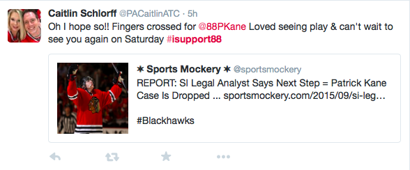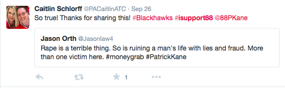 On the flip side, those who tweet for his “freedom” and “innocence” don’t want him to be innocent for the benefit of his accuser. They seem to wish ill will towards her for causing such a “distraction.” They want Kane to play. They don’t want #justice because if they really wanted justice then they would want a fair trial and for Kane to be part of that trial. Not going to trial is very different from being innocent. And again, innocent until proven guilty just means that he doesn’t go to jail, it doesn’t mean that you get to live your life free from suspicion. Yet, many have applauded and woohoo’d his presence when that evening’s events are still in question. If Kane is guilty of rape, whether legally convicted or not, you are standing and cheering for his behaviour both on and off the ice. You are cheering for his entitlement. Unfortunately, we may never know the truth, so wouldn’t it be wise to err on the side of caution and not accidentally woohoo a rapist? This is where the Blackhawks organization needs to step up and take that option off the table until the investigation has concluded.