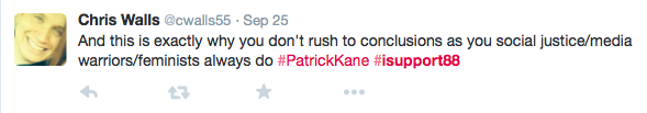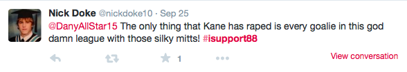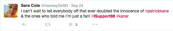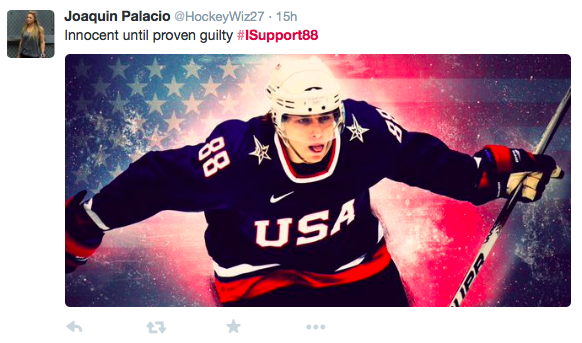 While #isupport88 has a nice ring to it, those who use it might as well tweet #isupportallegedrapists because that’s exactly what is being encouraged. Through this collective hope for Patrick Kane’s “innocence” and/or “justice” the world becomes more hostile against all women, not just his accuser. If this is your goal, then congratulations. If not, then #letstalk.