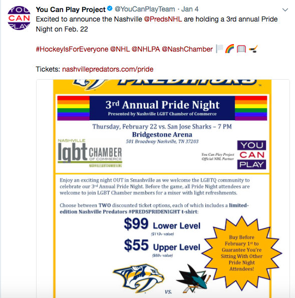 Preds 2018 YCP night Published January 11, 2018 at 589 × 595 in Hockey is for Everyone nights and Hockey is for Everyone ambassadors: Deconstructing the NHL’s commitment to inclusion and diversity heading into 2018 ← Previous Next → 2018: Nashville Predators’