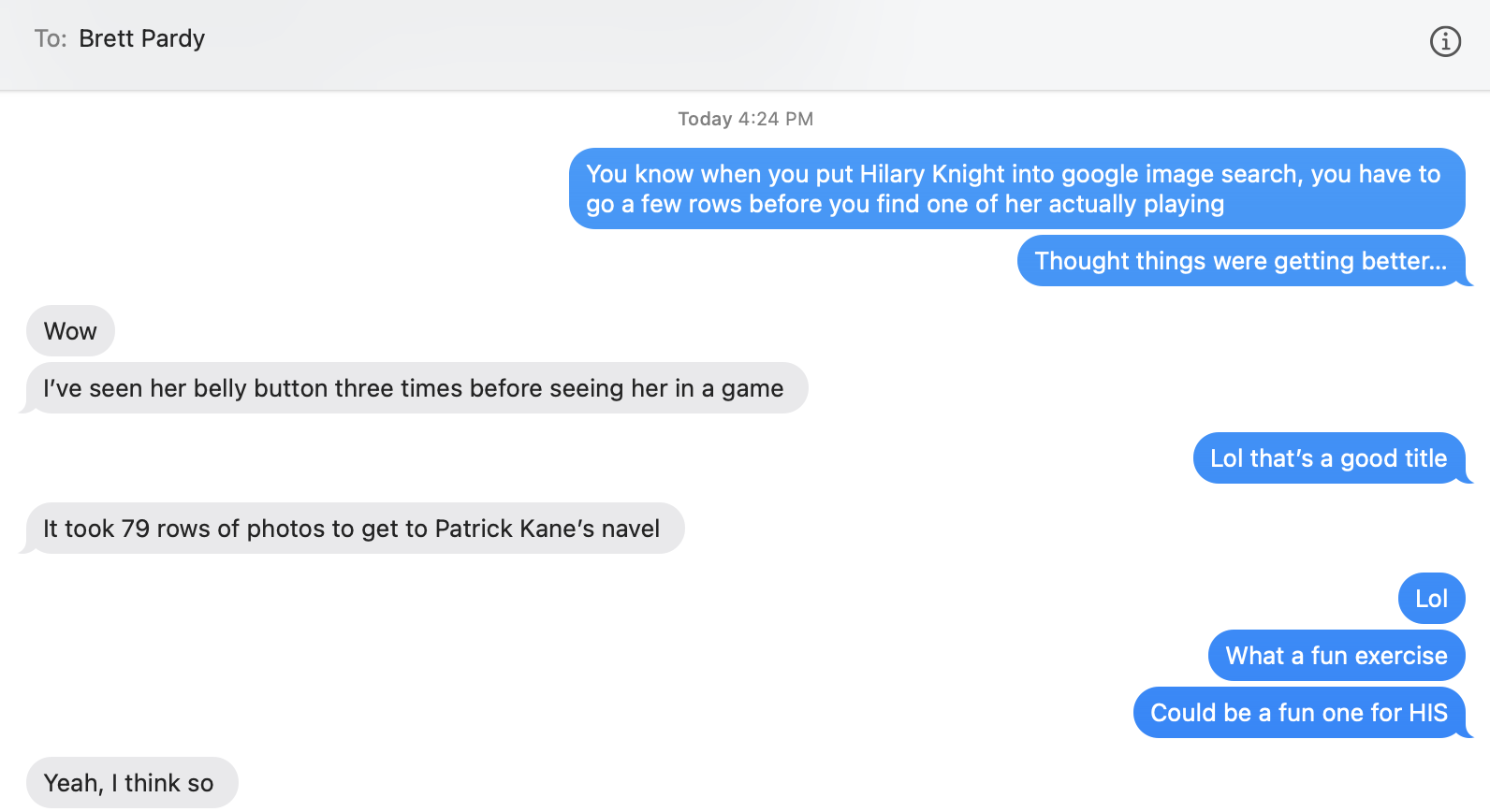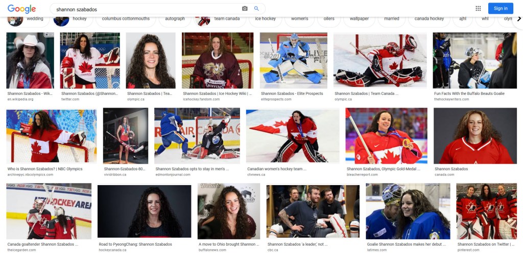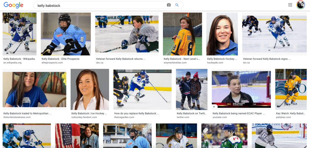 These are all perfectly fine photos but I wanted one of Knight playing hockey because the other photos on the slide were of Zdeno Chara and Johnny Gaudreau…playing hockey. I’m quite selective about the images that I use in lecture slides because it’s one way to challenge assumptions and teach things without actually saying the words. My slides could definitely use more diversity with respect to ability and body size but one thing that my students are guaranteed to get are images of a variety of badass women and girls doing badass things. I texted Brett my surprise at how far down I had to scroll to find a picture of Knight actually playing hockey: