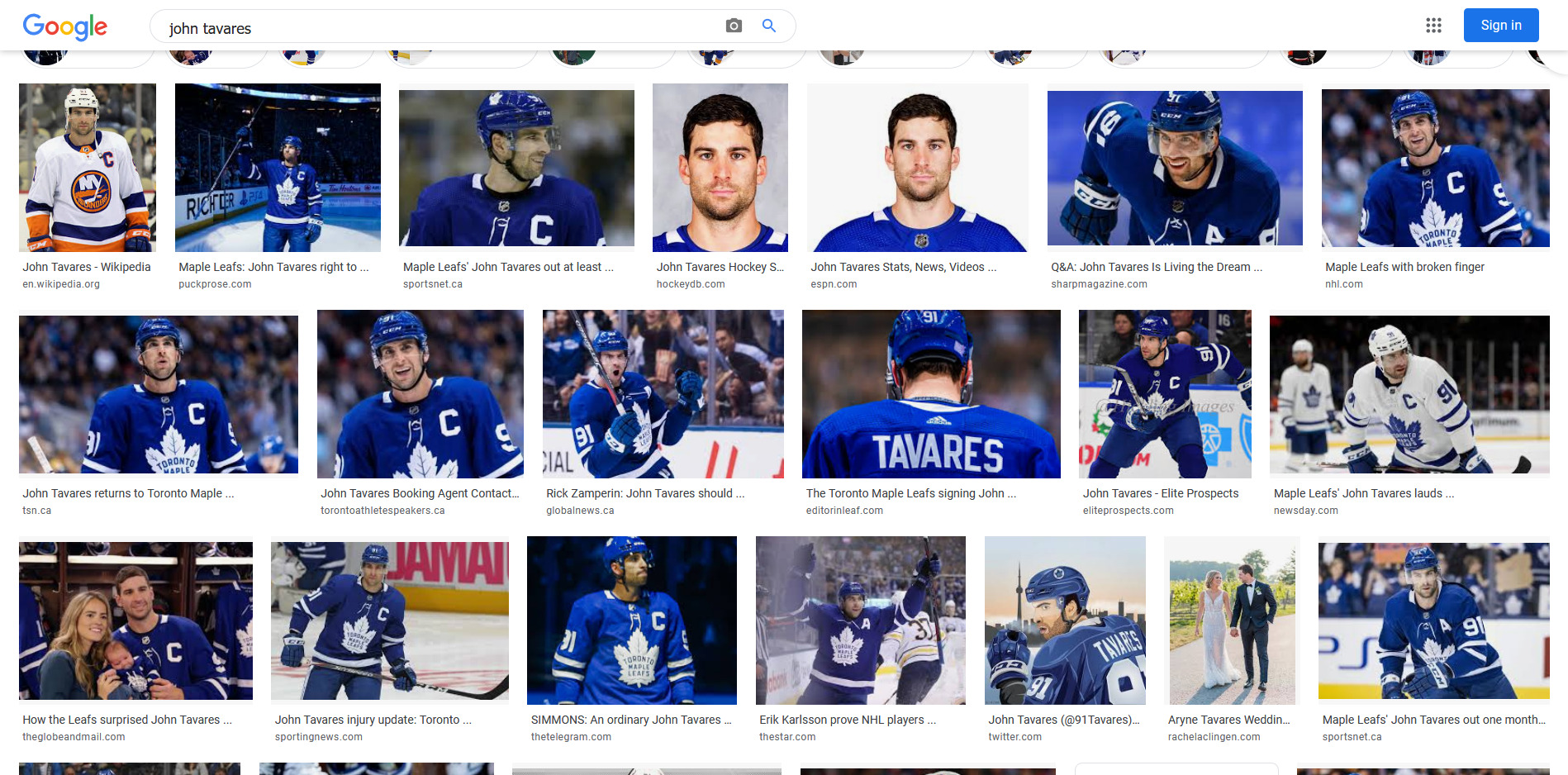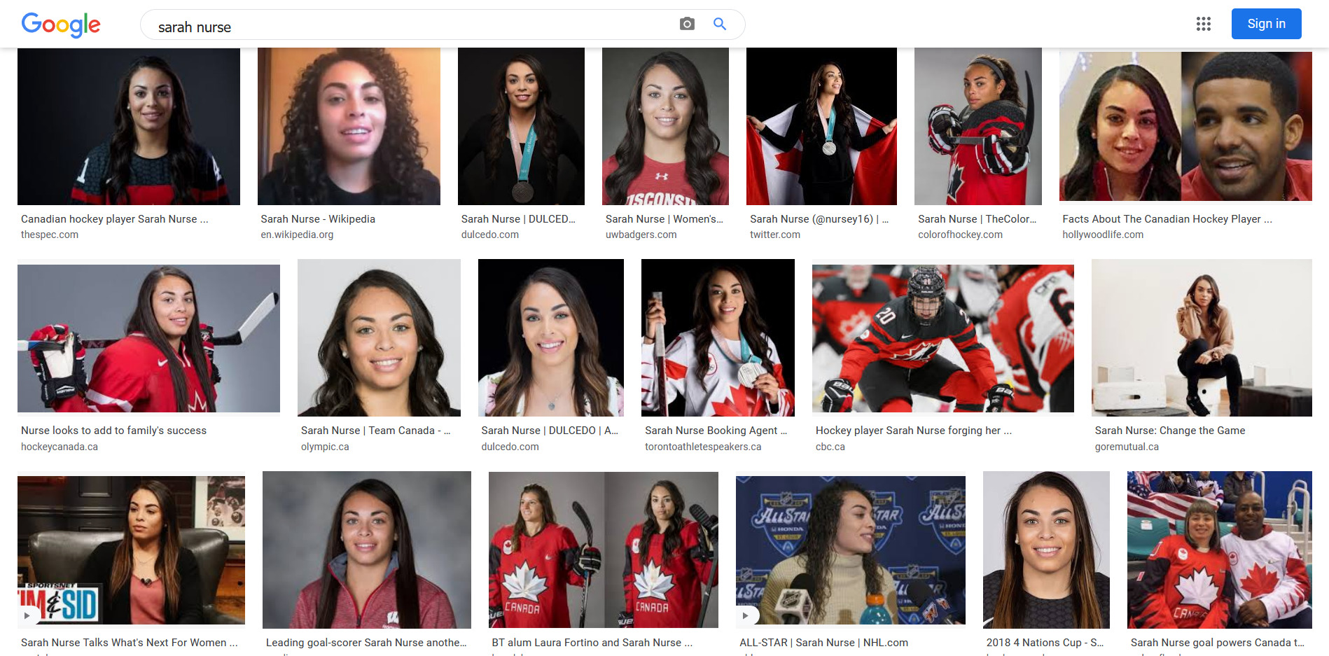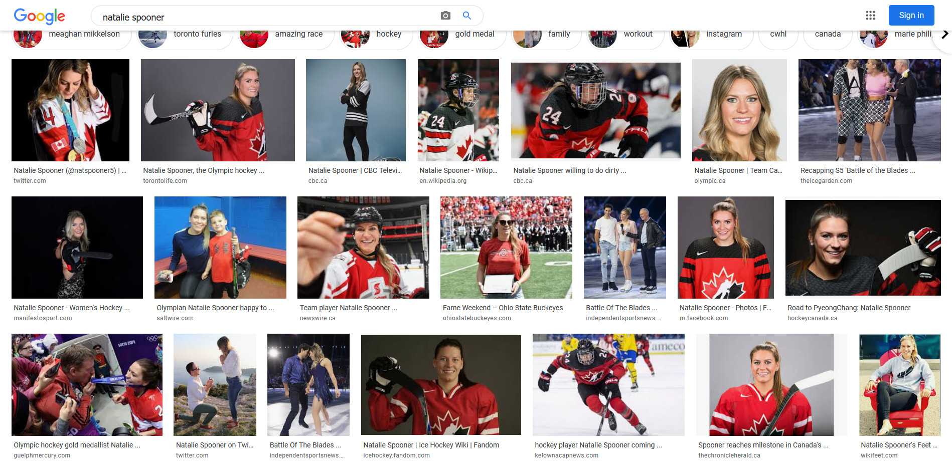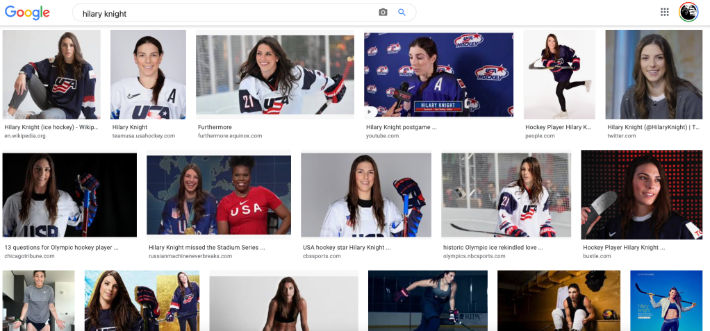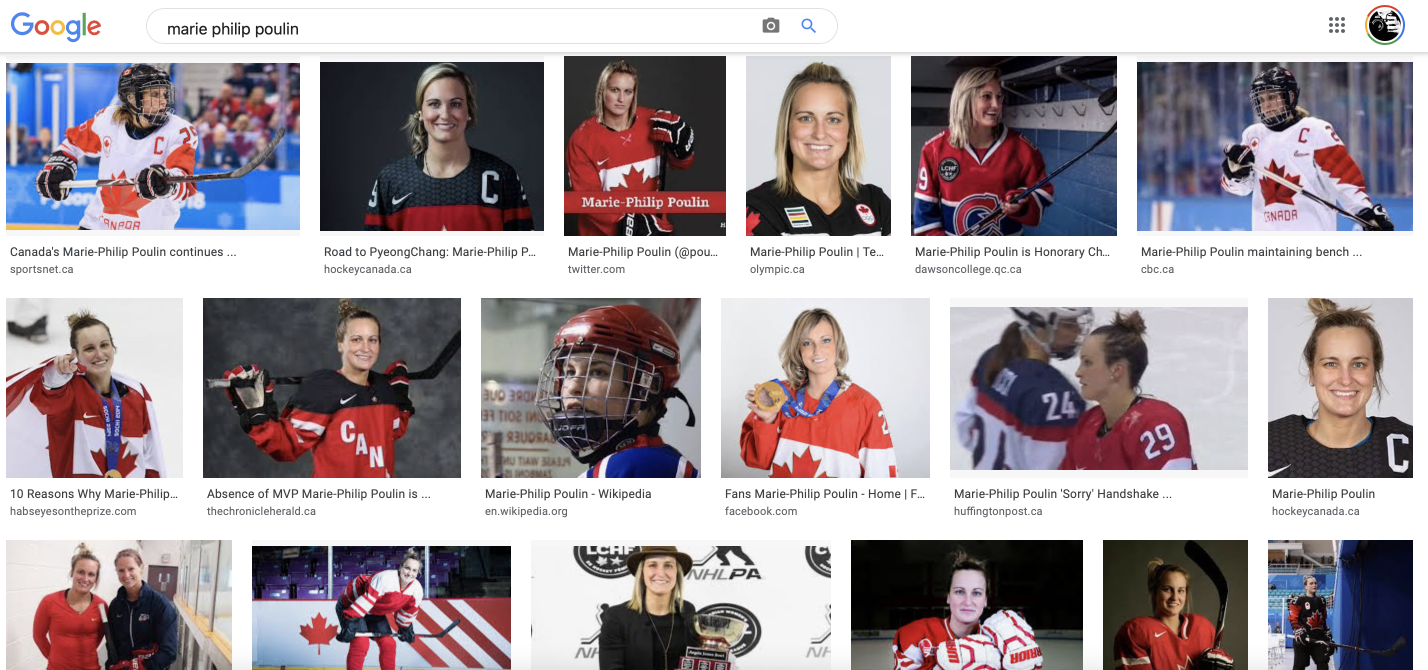 For example, for Hilary Knight, out of the 27 images that appeared in the first five rows of images, only one image shows her playing in a game (4%). To see Knight with her Olympic gold medal, you have to scroll down to row 7. For Marie-Philip Poulin, the very first image that appeared was of her playing in a game. Still, of the first 28 photos that appear, she is only actively playing in eight of them (29%).