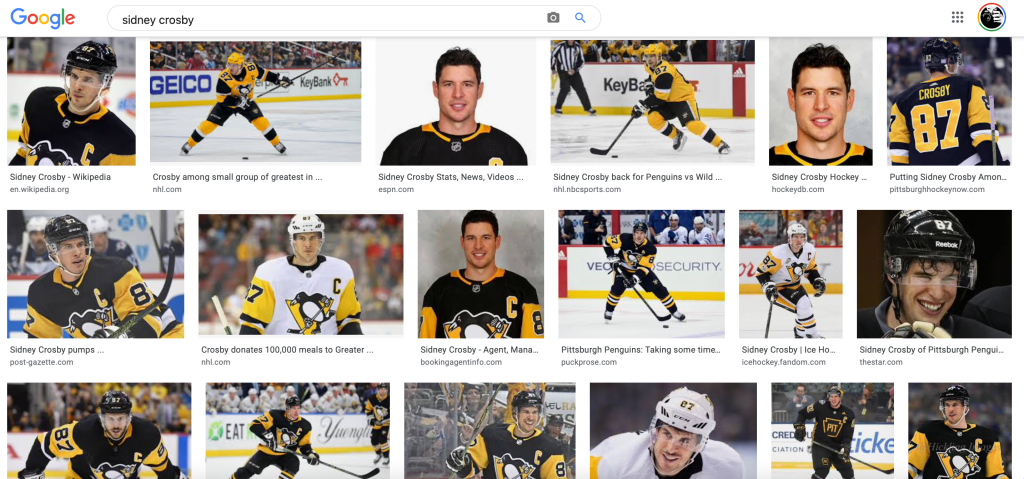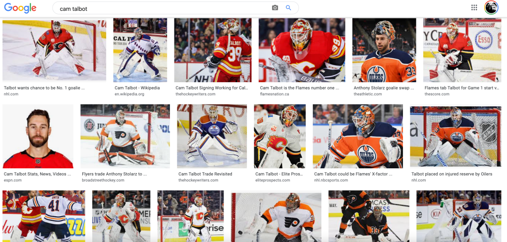 We took screen shots of the first three rows of images for each player because that is what fits on the screen, but we counted the first five rows of images. Google results do vary by individual based on your own search history, but both of us found similar results. We wanted to know: How many images show the player actually playing in a game? Photos that showed full gear with helmet on were considered “playing” hockey.