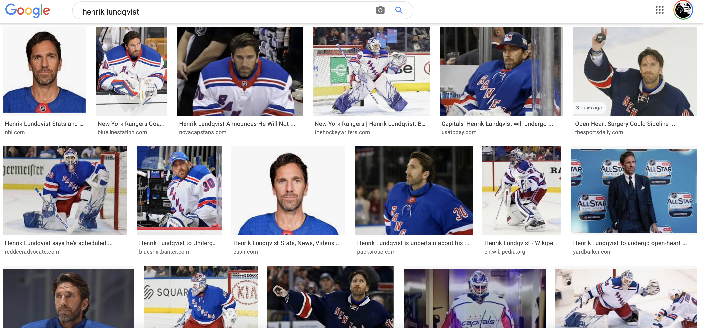 Henrik Lundqvist, with his beautiful hair, may be the outlier for the men with 15 of his first 27 photos not in full gear.