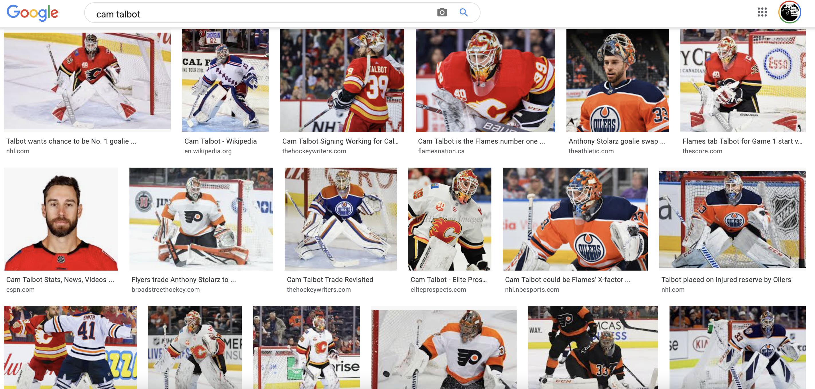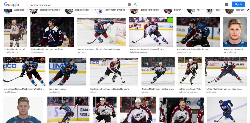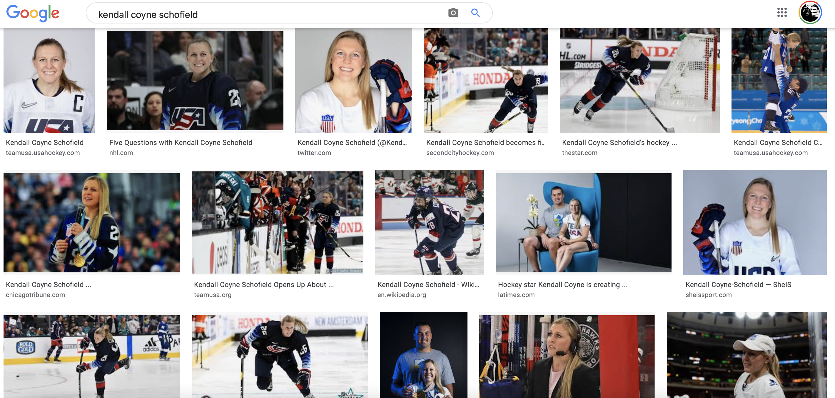 Similar to Hilary Knight, Kendall Coyne-Schofield can be seen playing hockey in one of her first 25 images (4%). One! There are a number of images from her participation in the 2019 NHL All-Star weekend’s fastest skater competition. That’s cool but she can skate with a puck too. You want to see that Olympic Gold medal of hers? You’ll have to scroll down to about row 9 and in row 6 she can be seen playing for the NWHL’s Minnesota Whitecaps. In row 18, you might be able to spot her playing in a PWHPA jersey. Her husband, NFL offensive guard, Michael Schofield, appears in 5 of her first 25 photos. To be fair, Coyne-Schofield also appears in 4 of her husband’s first 32 photos. But his results are further complicated by the fact that Michael Scofield (with no ‘h’), the character played by actor Wentworth Miller in the tv series Prison Break, appears in 15 of those 32 photos. Do what you will with that information.