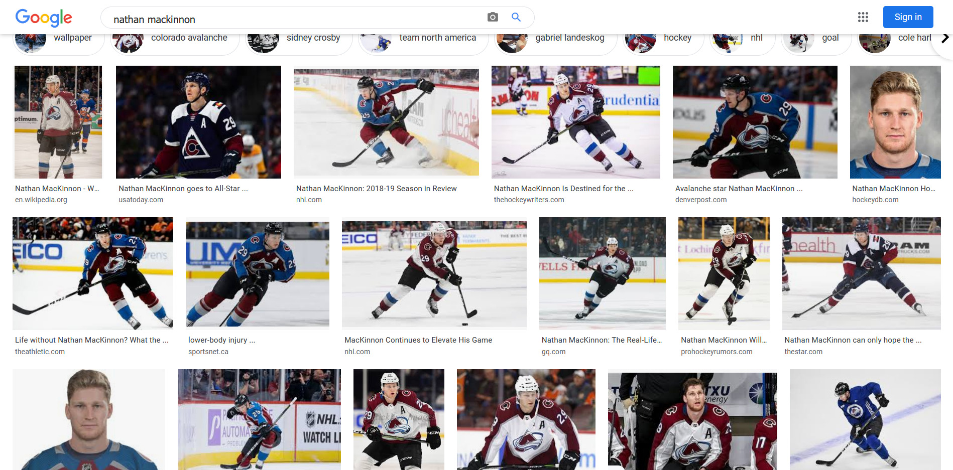 Nathan MacKinnon, is all business, with 86% of the pictures in his first five rows showing game action.