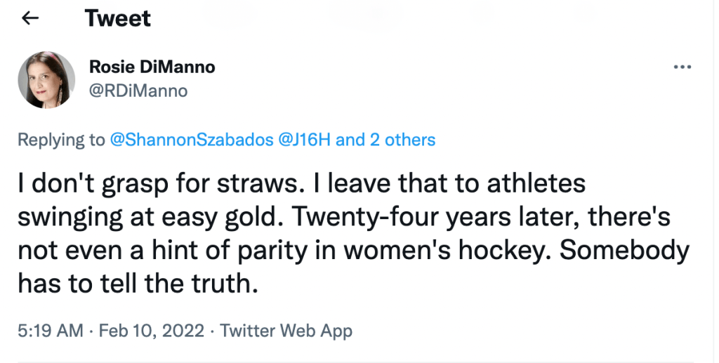 4.) Where else does women’s hockey belong? If Dimanno doesn’t think that women’s hockey belongs in the Olympics, it begs the question: Where does women’s hockey belong? There is literally nowhere else right now where women’s hockey gets this kind of stage. The fact that there is any development and growth in women’s hockey around the world is because of the Olympics, not in spite of it. Any consistent viewer of women’s hockey has seen the growth of the game and the talent develop across nations. Does it still look bad to those who tune in every 4 years? Of course it does. But that’s like reading every 4th page of a book and saying that it has poor flow and leaves a lot to the imagination. Women’s sports, in general, has a very short history and we are only now getting to the plot. It’s unfortunate that Dimanno’s attention hasn’t been captured in these introductory chapters but that’s her loss. What’s most hurtful is that someone with a platform to add texture and nuance to the story of women’s hockey decided to use that space to echo the sexism that comes from Twitter accounts with one follower. Never have we seen someone “advocate” for equality by getting rid of the opportunity all together. There are definitely problems with the Olympics with respect to parity but excluding women’s hockey will solve none of them.
