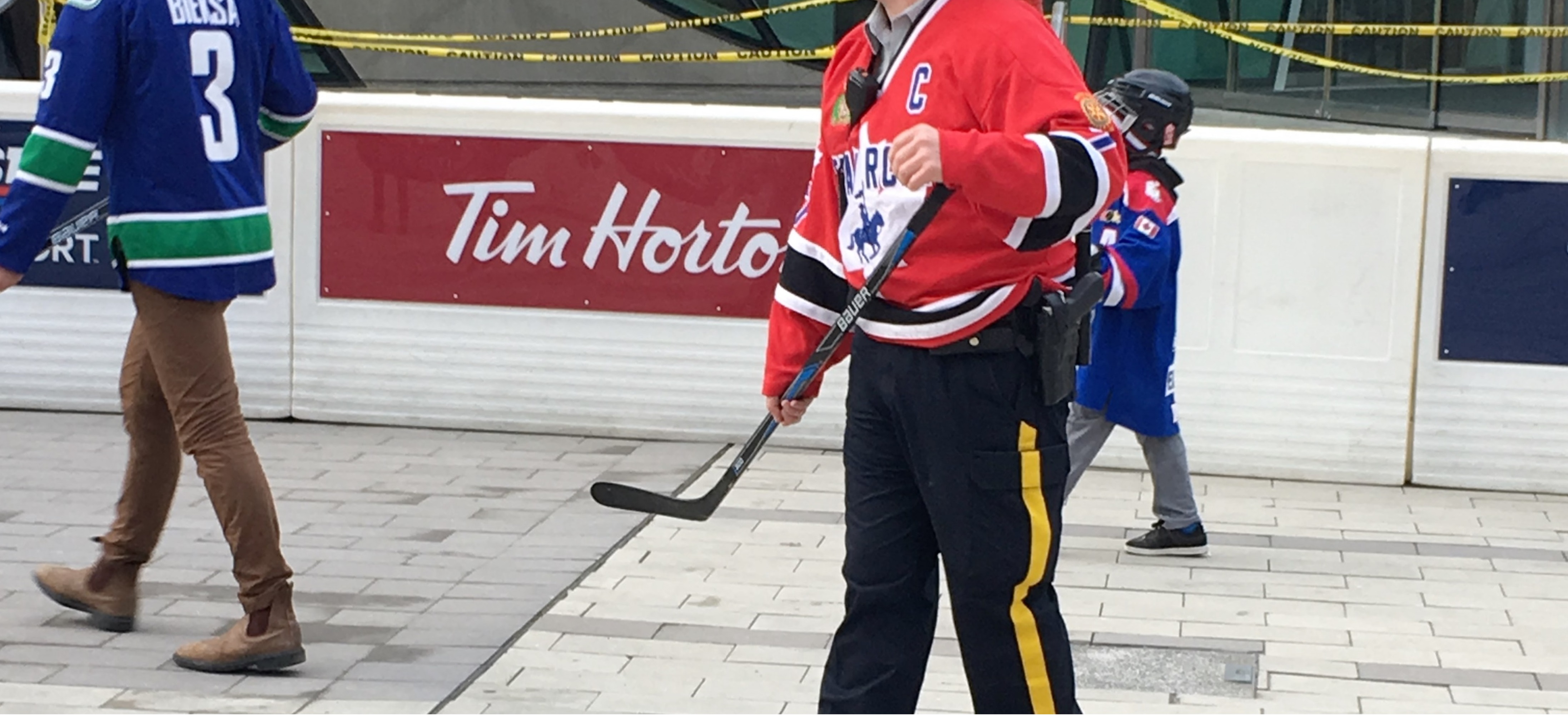 There was something cool about a broadcast in theory celebrating all of Canada and not just the NHL cities. What would have made it actually cool is if it dealt more with communities as whole and not just the hockey aspect. I have a limited sample size, as I only went to one of the Hometown Hockey celebrations in person (Surrey, BC) in 2017. Canada’s small towns are generally not the enclaves of picturesque ponds and cottages as presented in Canadian imaginary, but more often strip malls and cul-de-sacs full of pick up trucks. A suitable setting to broadcast from often has to be created to resemble the nostalgic image of a community town square. The broadcast was set up in a constructed square, featuring at one end the mobile studio where MacLean and Slone broadcast from behind glass and a stage at the other, which hosted live music and hockey trivia games. A large screen was set up for a community outdoor viewing of the game. There were also autograph sessions with local NHL alumni and a ball hockey rink, where I saw an RCMP officer playing hockey with a kid while still wearing his gun. The event drawing people to the set cultivates the image of an organically hockey-enthused community and actively produces the “hometown” for audience consumption. Other than the music, there was nothing there for someone who was not already hockey enthused to enjoy. Hockey is not as hegemonic to the Canadian experience as Hometown Hockey suggests. Less than one in four kids play hockey and only about one in three Canadians follow the NHL. The in-person event was not growing the game.