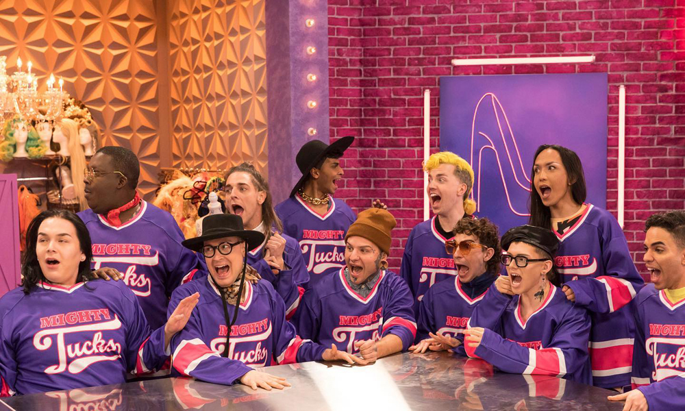 At first glance, this hockey-oriented challenge may appear harmless and a fun reference to Canadian culture. Within the first 10 seconds, it appears it might go this way. As the queens locate the bag with the hockey jerseys in it, there are excited bellows as they pull out jerseys with their drag names on them. One queen, Fiercalicious, exclaims, “They fit my name on a shirt!” (We’ll table the fact that she called it a shirt rather than a jersey for now). Since hockey is often rooted in notions of masculinity and heteronormativity, this mini-challenge appears to challenge these notions by effectively queering hockey. For instance, the name on the jerseys, a perfect drag parody to the “Mighty Ducks,” is the “Mighty Tucks.” Further in the challenge itself, the queens are asked to “audition” for a drag hockey team. Brad Goresky, one of the judges, instructs the queens that before their “gay premiere,” they must help design their uniforms. The sheer fact that the audience gets to watch these queens get into drag using hockey equipment and jerseys does a wonderful job at dismantling the typical masculine and heteronormative associations with hockey. The viewer watches as the queens scramble to grab hockey bags, cut and sew hockey jerseys, hot glue gun shoulder pads, and put on make-up. As the queens all walk into the workroom, one at a time, showing off the hockey uniforms they have constructed, Goresky introduces the queens, just as an announcer would speaking about different players at a hockey game. While the queens have likely constructed their introductions themselves, Goresky animatedly announces each queen’s introductions as they walk in. These include the typical introduction you would here about a hockey player, such as where they are from, what position they play, their nicknames and their hobbies outside of hockey. However, these introductions are anything but typical. Through these auditions, CDR queers hockey further by making queer references in their introduction while in their hockey drag. For examples, Goresky announces that Shada Jada Hudson hails from “Bottom-Boy, Ontario,” Fiercealicious’ nickname is “The holey one because any hole is a goal” and when Chelazon Leroux is not playing hockey, “She’s enjoying a nice hard puck.” The mini challenge, as a whole, is clever and fun and, on some level, does help subvert traditional gender and sexual norms within Canadian hockey.