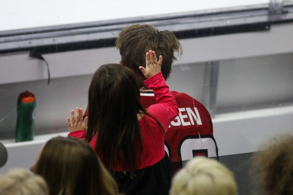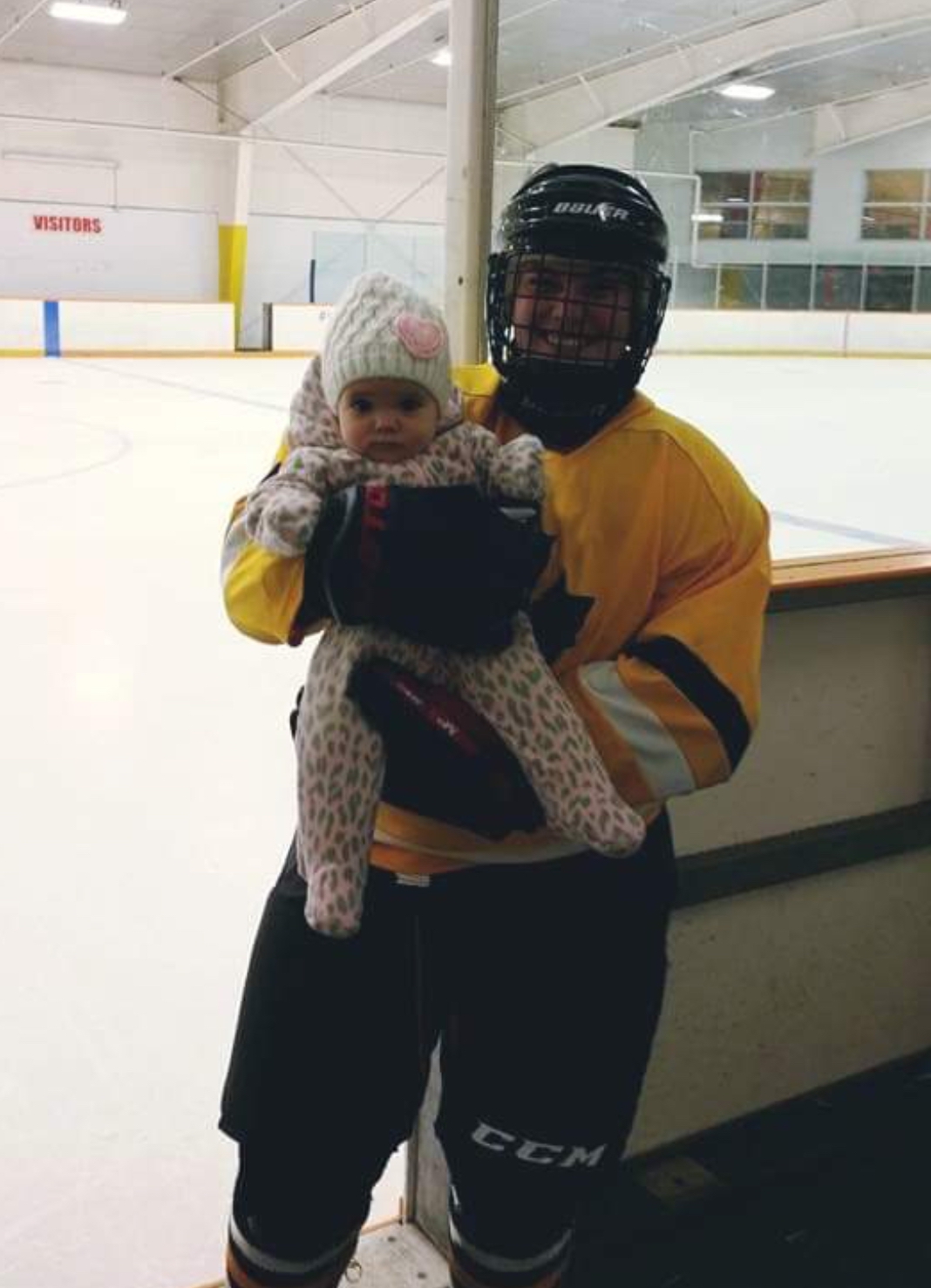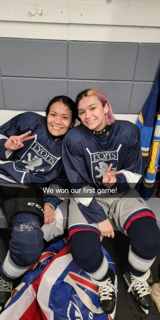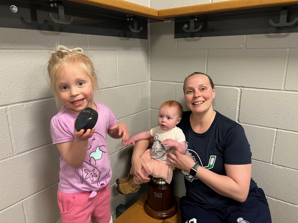 Our oldest daughter is very curious about hockey and the fact that we are able to play. She is interested for a few minutes but slowly loses interest, no fault of her own. Kids don’t understand the ‘me time’ so they continue to seek you (mom) out during the game for questions and their own needs. I think the social aspect of the game (locker room and on the ice) is fun for them since they get to meet new people and see women enjoying a sport.