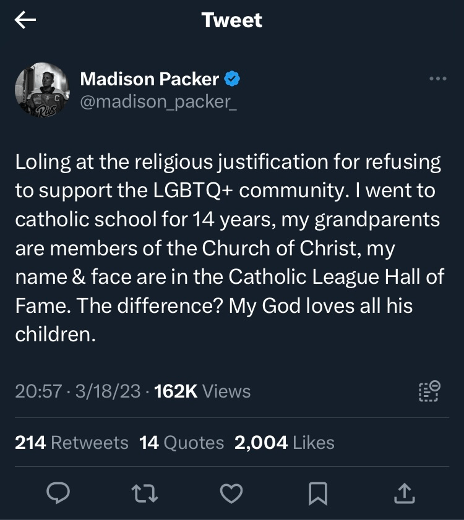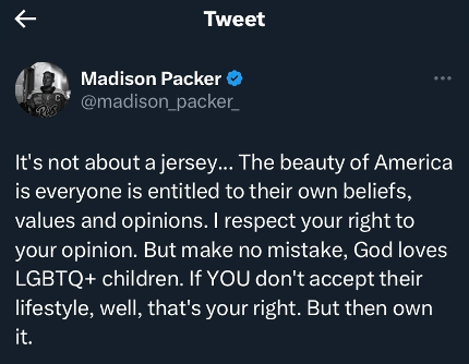 You have religious freedom, and the NHL has made it clear that it is a player’s choice to participate in Pride night, but I am confused why religion and LGBTQI+ inclusion need to be oppositional. Madison Packer, an American ice hockey player, highlights this well in her tweet: