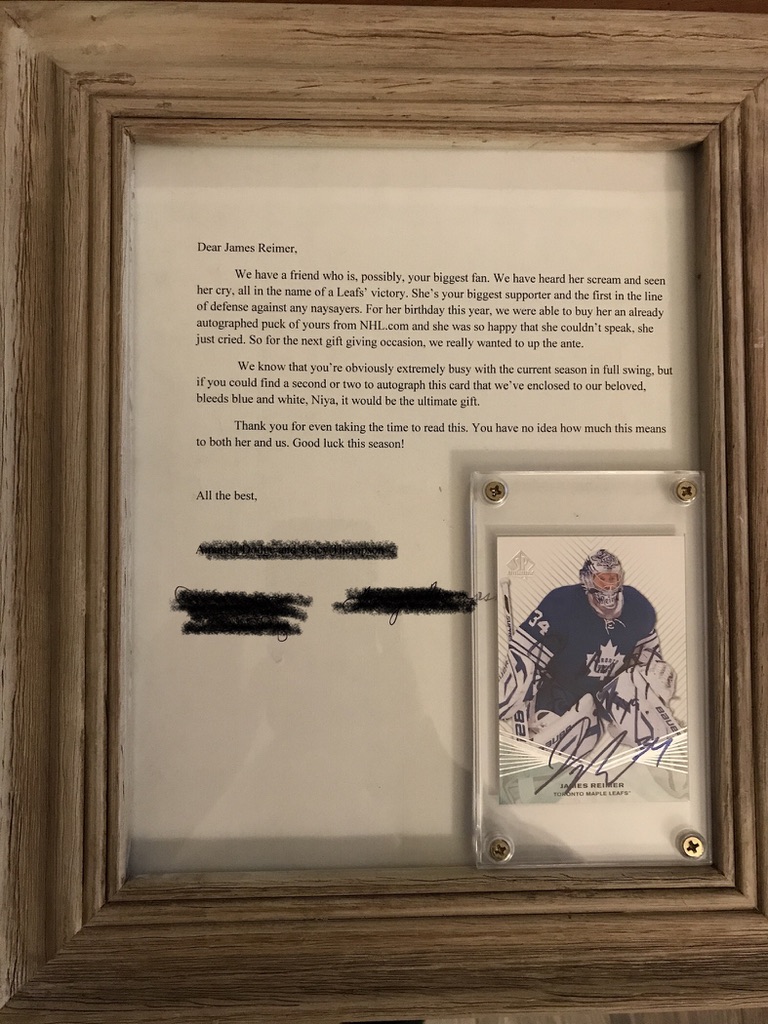 Once upon a time, I was your biggest fan. Even when most of the Toronto Maple Leaf fandom questioned you as the starting goaltender over Jonathan Bernier, I fervently advocated for you. I saw your passion for the sport, and win or lose, I could tell you placed everything on the ice every night as you went out to defend your team. And gosh, some nights you were just spectacular, saving a dismal defence from complete annihilation. In the crushing defeat in OT of Game 7 in 2013, my heart wrenched not only as a Leafs’ fan but as a James Reimer fan. I knew you had given it your all: my heart broke for you. I was such a James Reimer fan that my two closest friends at the time mailed you a letter (see below) and requested you sign your card for me. It was the best gift anyone had ever gotten me.