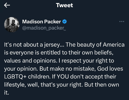 You have religious freedom, and the NHL has made it clear that it is a player’s choice to participate in Pride night, but I am confused why religion and LGBTQI+ inclusion need to be oppositional. Madison Packer, an American ice hockey player, highlights this well in her tweet: