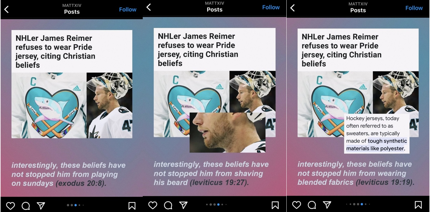 Now, I’d like to focus specifically on your religious justification. Following Matt Bernstein (@mattxiv), a queer Jewish activist, who has a significant social media presence, you have “cherry-picked” what parts of the bible you follow. Yet, in your statement to the press, you noted, “In this specific instance, I am choosing not to endorse something that is counter to my personal convictions, which are based on the Bible, the highest authority in life.” It seems you pick and choose which parts of the Bible you choose to abide by and which to ignore. Here are some examples of what I am referring to, taken from Matt Bernstein’s Instagram account: