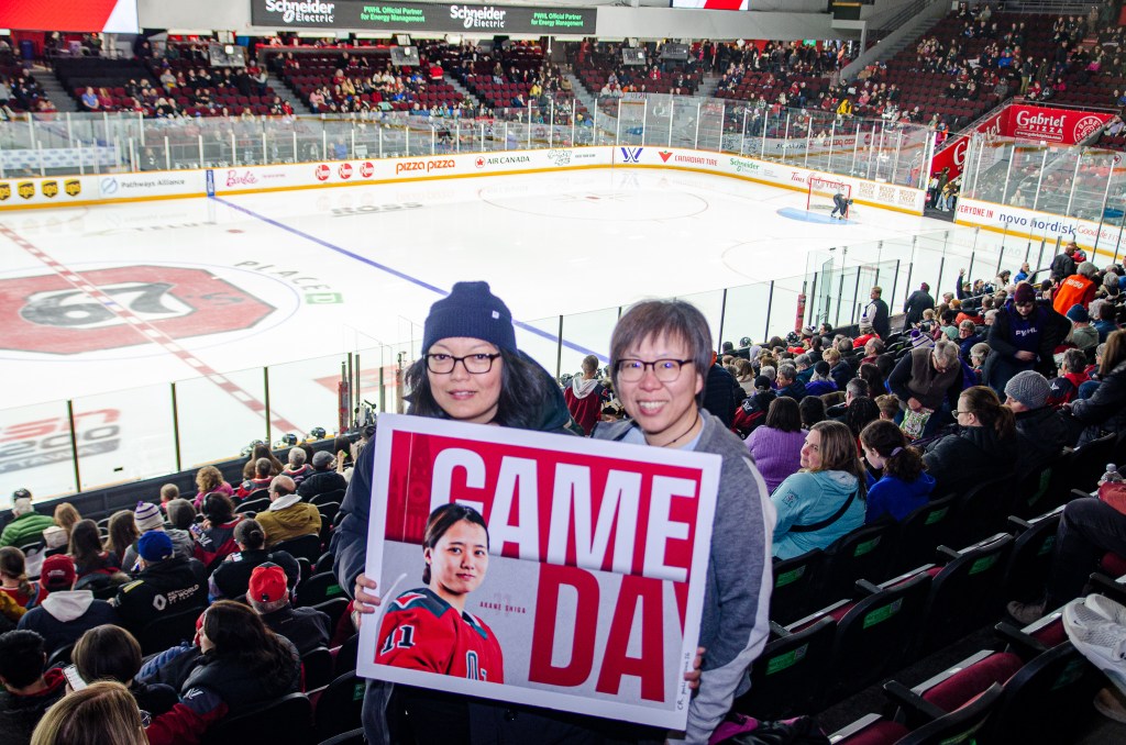 Kate and Margaret made the road trip from Toronto to Ottawa for the game and the chance to cheer on Akane Shiga at home. When I asked what the PWHL means to them Margaret stated, “I think it’s a glimpse of hope that we will be able to see gender equality in professional sports.” ❤️ Kate requested more coordinated watch parties or specials at the local sports bars to ensure that fans who can’t get to some of these sold out games are still able to participate in the fan culture. I’d also tack on to Kate’s suggestion that sending a couple of merchandisers to select watch parties would be really helpful for fans who want to purchase merch but can’t get to a game. Margaret commented that some extra labour is needed from the women’s game to overcome the preconceived notions that women’s hockey won’t be as fast or exciting as the men’s game.