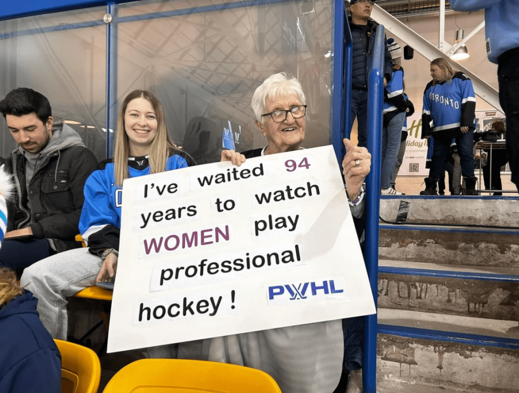 During Liz Knox’s (PWHLPA) recent interview on The End of Sport podcast, she referred to three main fan groups/story lines that she has observed this season. First, is the story of the young girls who get to grow up knowing nothing but packed stadiums for the best in women’s hockey. Second, is the ability for families to attend PWHL games as affordable family entertainment. And, the third group is “the old gals.” Knox talked about meeting a group of women, presumably in their late 50’s/early 60’s at the Real Sports bar before The Battle on Bay Street. They had travelled 2.5 hours away from Huntsville, Ontario for the game and used white tape to cover up the Maple Leafs portion of their jerseys. Knox goes on to say, “What a cool gift to give a generation of players who were probably told ‘you can never play hockey.’ Or, if they did, they changed in the broom closets, they heard every name under the sun, and they were ridiculed and made fun of. What a full circle moment for those women to be able to go to a professional game and see the next generation have this dream that, for them, was probably crushed at such a young age.” In that moment, I realized that I had to write a piece highlighting more of the “old gal” (loosely interpreted) stories, herein referred to as the OG fans. (Note: OG is slang used for “original gangster” but also more commonly “original.” In this context, I am borrowing OG to both reference “Old Gals” and original fans).