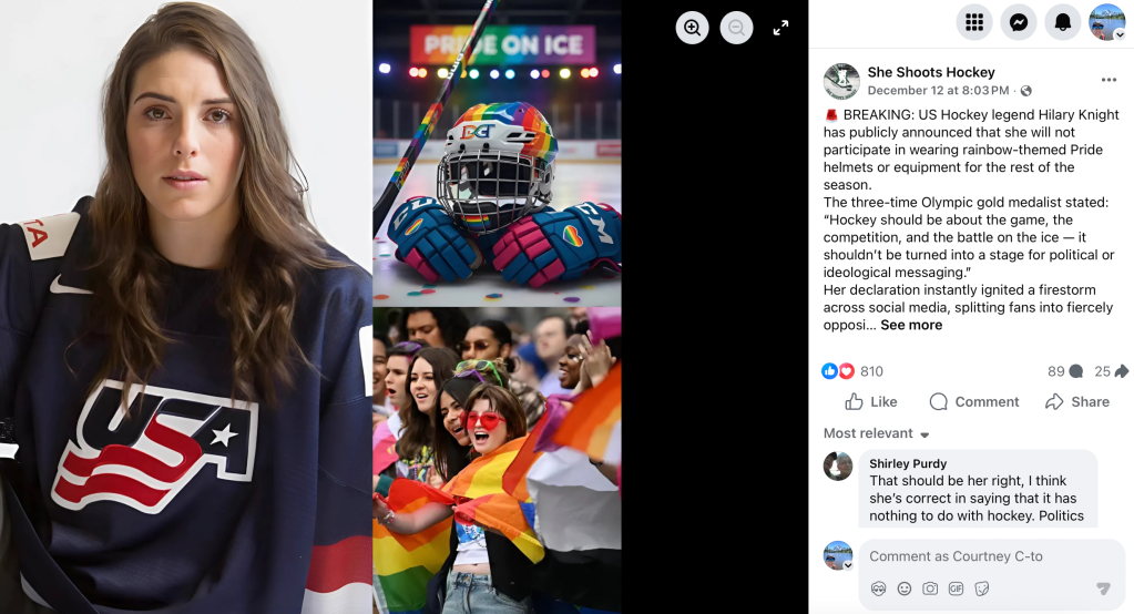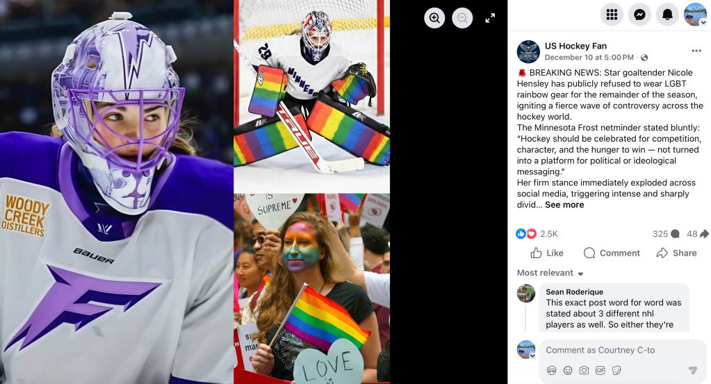I haven’t gone back through all of the posts but the news about Coyne Schofield not participating in Pride Nights was also posted on December 7, 2025. A friend asked me if I had heard about this and I wondered if what she had seen came from one of these kinds of sites. I showed her a post and she said “yes, that is what I saw.” These anti-Pride Night posts have the most engagement on them of any posts — hundreds or thousands of likes when most other posts get maybe 6 likes. Judging from the spelling/grammar of some of the comments and the fact that Nicole Hensley supposedly commented “Yes yes yes, someone finally says it like it is” on the December 7th post about Coyne Schofield, these are bots as well. But either: 1.) Real people are commenting and like players pulling out of Pride Night games or 2.) there are folks on social media trying to create acceptance for these regressive perspectives in women’s hockey.