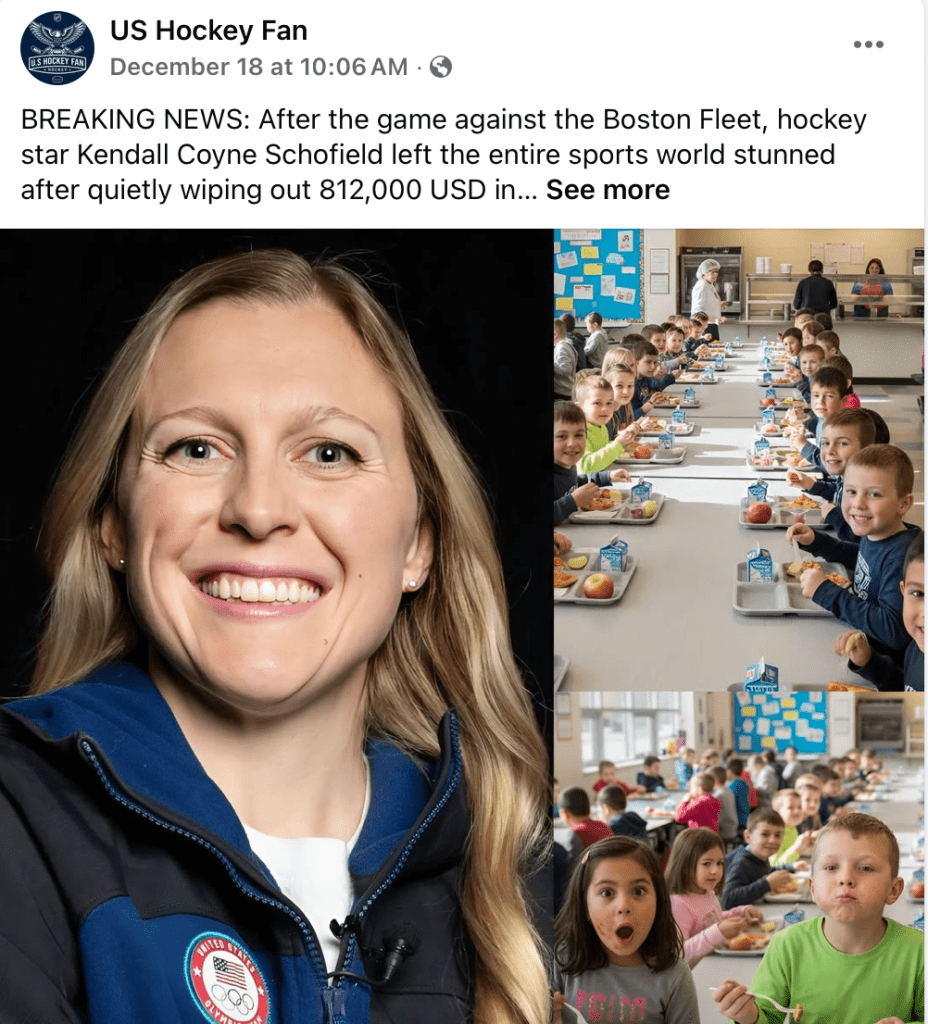 The caption for this post reads: “BREAKING NEWS: After the game against the Boston Fleet, hockey star Kendall Coyne Schofield left the entire sports world stunned after quietly wiping out 812,000 USD in school meal debt for students across 103 schools.